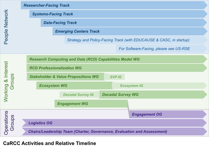 CaRCC comprises three main areas of activity – the People Network, Working & Interest Groups, and Operations Groups. There are several ways to participate in and contribute to CaRCC and the community. The structure and governance of these groups is described in the CaRCC Charter and in the Activities Groups Definitions and Roles document.